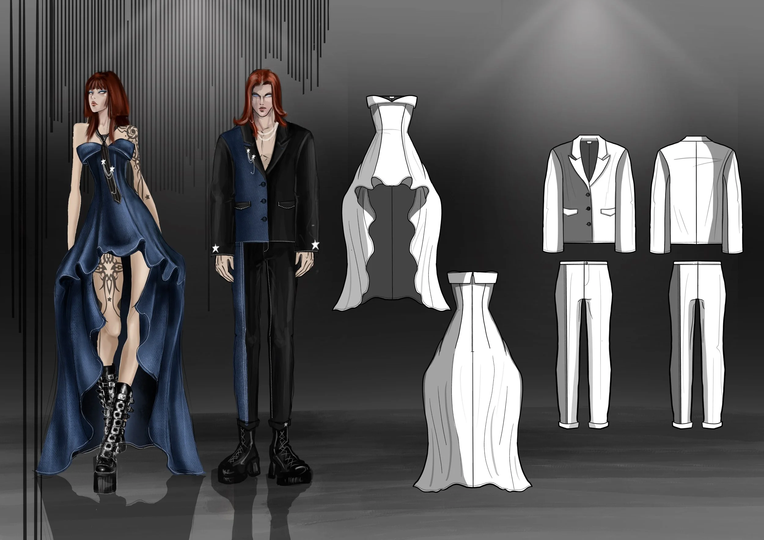 Created two original looks—one womenswear and one menswear—designed using gabardine and denim fabrics. Selected among top students to be featured in the ITU digital 3D runway show. The designs were developed and visualized entirely in CLO3D, and officially presented on the virtual runway.